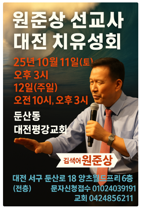 일시 25년 10월 11일(토) 오후3시 12일(주일) 오전 10시, 오후3시문자로 신청하면 오시면됩니다.참가비용없습니다.폰번호 참석 이름 오시는 지역 선착순 300명입니다.문자주시면 안내사항 보내드립니다.폰 010-2403-9191 주소-대전 서구 둔산로18 향촌월드프라자 6층주차가 어려우시...